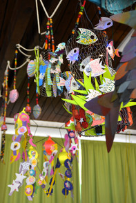 L'idée était de créer un récif de corail en utilisant des matériaux recyclés, avec la participation de tous les enfants de la maternelle. Des ateliers de peinture, de création de colliers, de graphisme, etc., ont été organisés. L'installation a été réalisée par l'artiste intervenante.