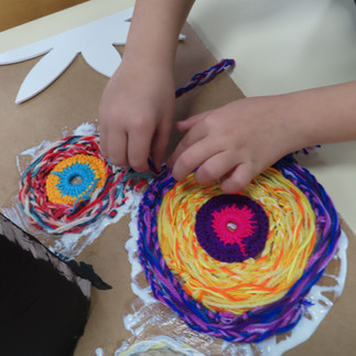 Nous travaillons main dans la main pour donner vie à un univers imaginaire et coloré. Chaque enfant apporte sa touche personnelle en explorant une multitude de techniques : du dessin au collage textile, en passant par le travail minutieux des tresses. C'est un véritable "work in progress" où les matières se mélangent pour créer une œuvre riche et foisonnante.